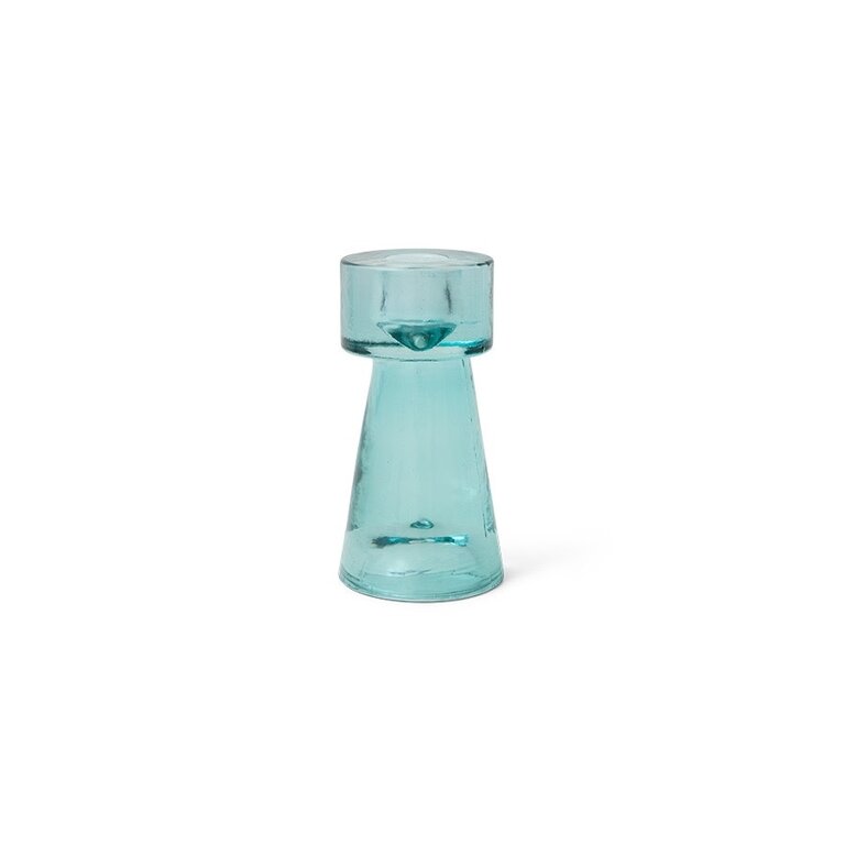 100% Soda lime glass 6,7x6,7x13cm Delicate and full of charm, the small ice blue candle holder adds a soft touch to any corner. Its glass body catches the light beautifully—perfect for creating a calming glow on a shelf, side table or bedside nook.