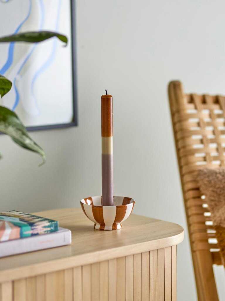 The Eja Candle Holder by Bloomingville is a bowl with an integrated candle holder in a striped brown glaze. Use it as a decorative element in your home or to create a cozy and atmospheric ambiance. It will add a modern and stylish touch to your decor.