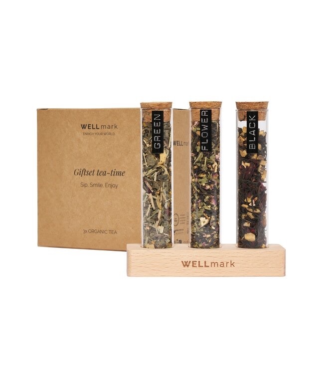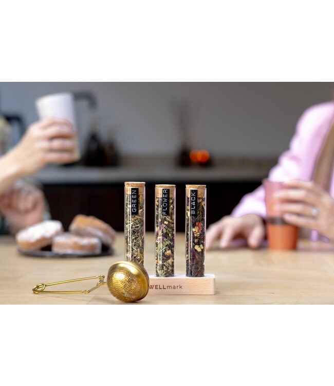 Account aanmakenUnwind with our tea-time gift set, designed for those cozy tea moments around the table. This set offers a delightful experience with organic and pure teas in three flavors: floral, black, and green tea. Packaged in small glass holders with corks, nestled in a wooden holder which also makes this product the perfect gift for real tea lovers and it's also a nice addition to the table at a high tea.