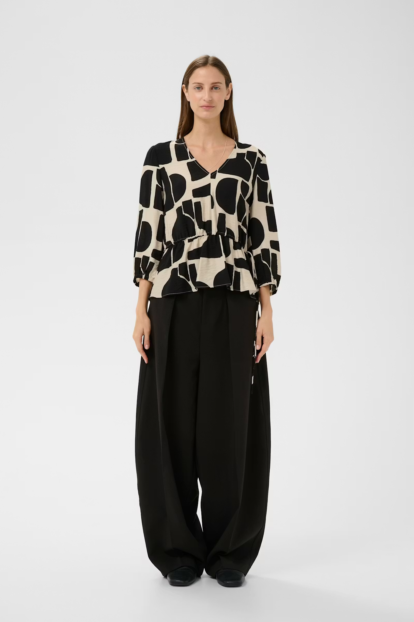 Graphic blouse with relaxed silhouette features a deep V-neckline, long sleeves, and an adjustable drawstring waist detail for added shape. Unique architectural print elevates this modern piece.