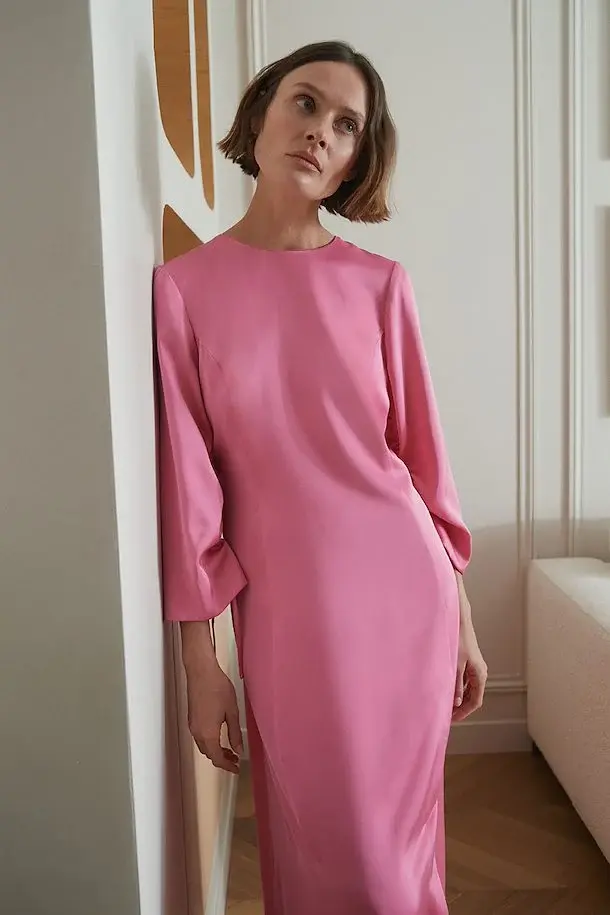 Account aanmakenLong, pink dress in smooth satin with a round neckline and 3/4 sleeves featuring tie details. The dress has a back zip closure and a small front slit.