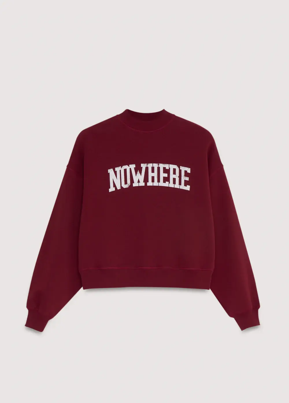 A cozy crop-style sweatshirt featuring a ribbed high neck and a bold NOWHERE print on the front. Brushed on both the inside and outside for extra softness and warmth, perfect for casual, everyday wear.