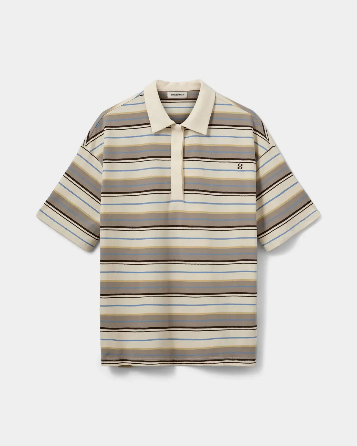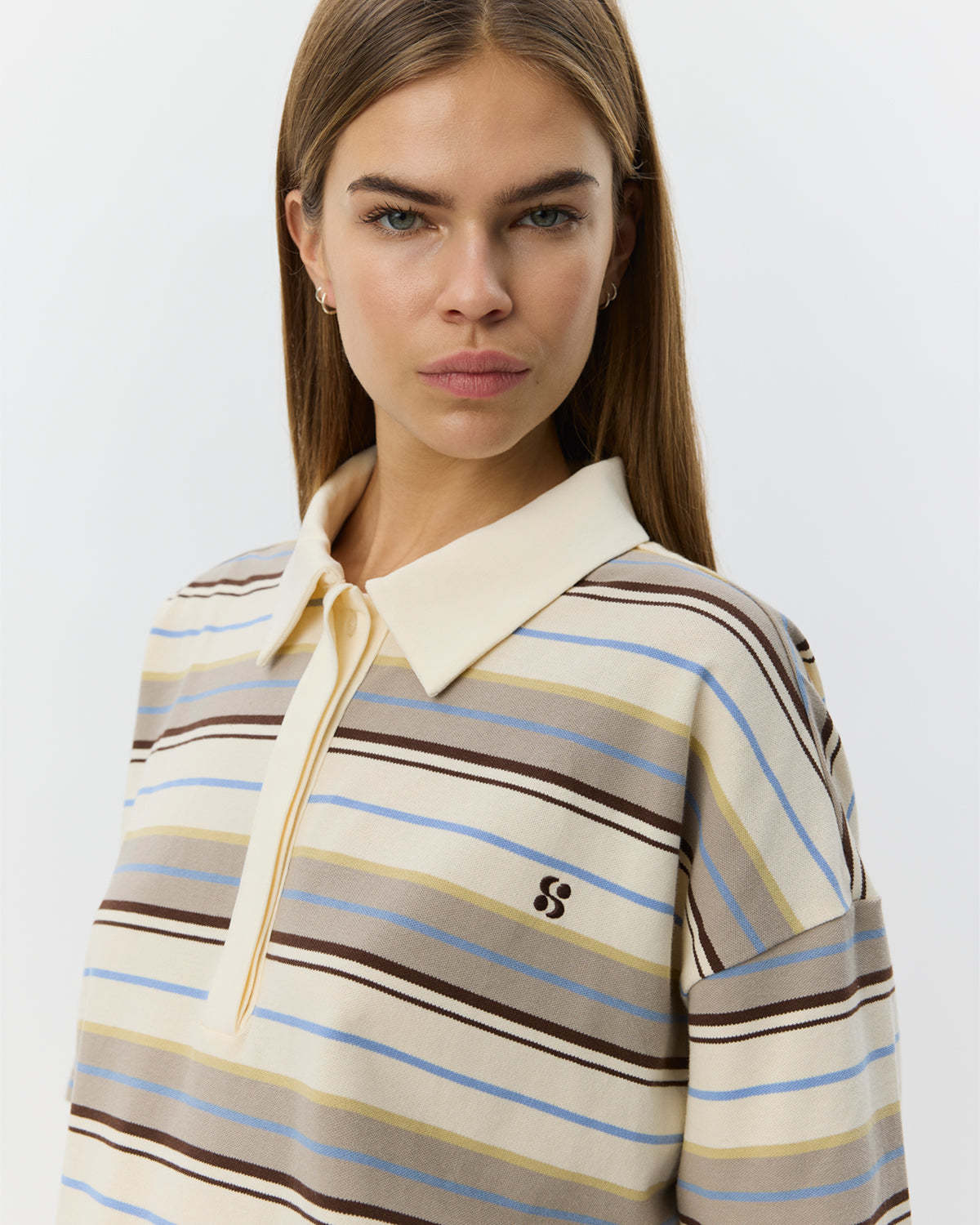 Classic polo collar • Hidden button closure • Embroidered logo on the chest • Short sleeves • Oversized • Horizontal stripes in different sizes • The model is 179 cm tall and wears size S