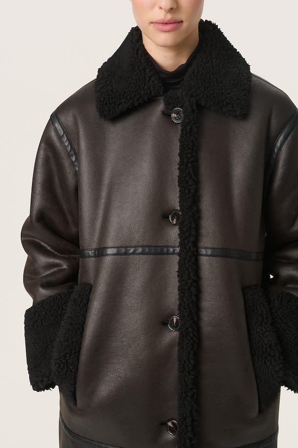 Long coat in faux leather, with button closure at the front and open pockets. The coat features a lined section at the collar, sleeves, and hem. The model is wearing a size M.