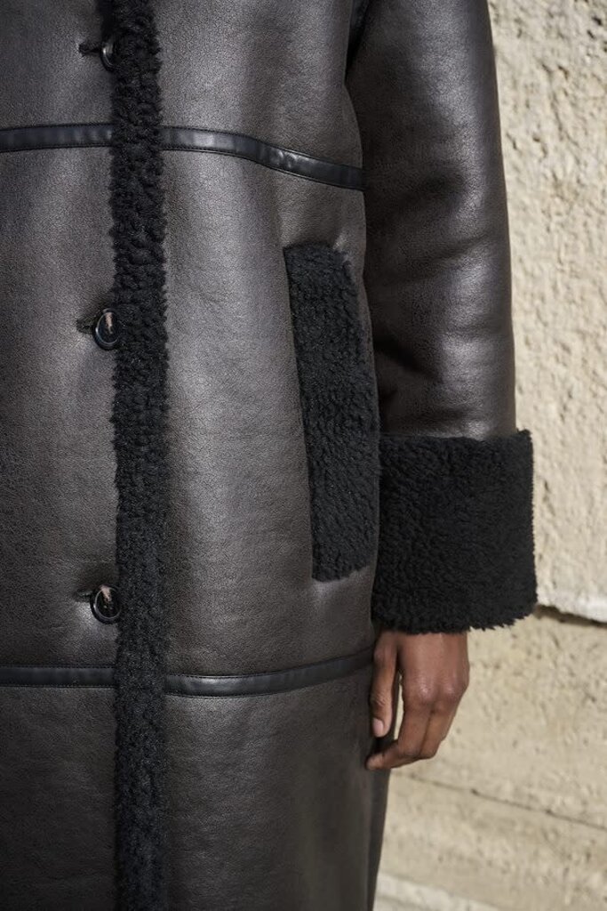 Long coat in faux leather, with button closure at the front and open pockets. The coat features a lined section at the collar, sleeves, and hem. The model is wearing a size M.