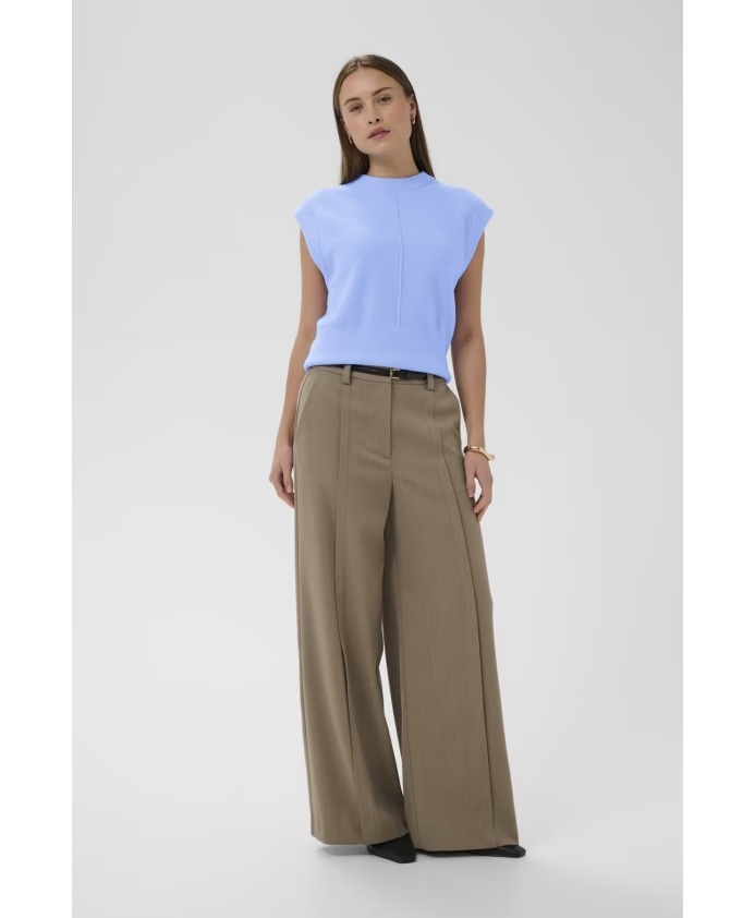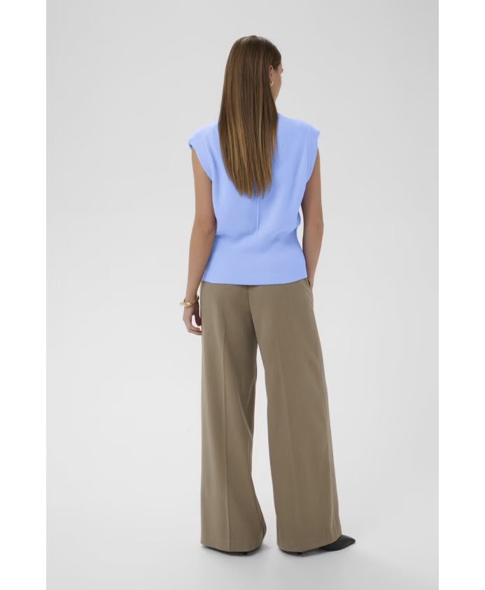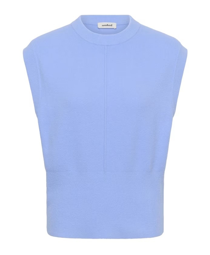 Sleeveless vest top featuring a straight fit, subtle ribbed hem, and structured mock neck. Distinctive vertical center seam detail on soft-finished fabric adds a refined touch to this minimalist silhouette.