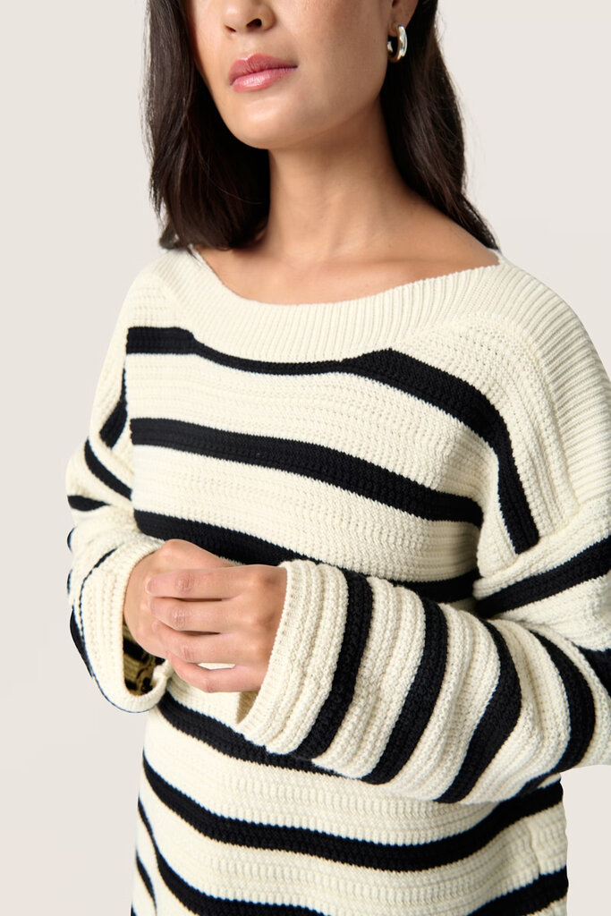 A striped knitted sweater with a relaxed fit that blends style and comfort. The wide boat neckline and long sleeves add a sophisticated touch, while the soft fabric ensures all-day comfort. Perfect for a casual yet stylish look. Model wears size M.
