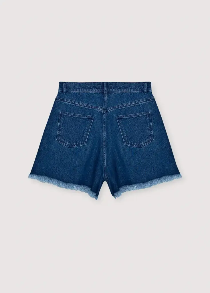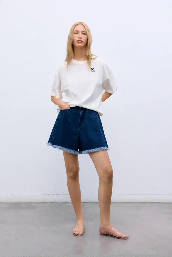 Dark wash denim shorts with a relaxed fit and a side cut that adds extra volume to the leg. Finished with a raw cut hem and a subtle branded embroidery detail on the back for a modern, distinctive touch.