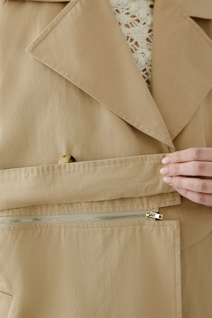 - Classic trench coat details, such as belt, back yoke, bar on the shoulder and arm