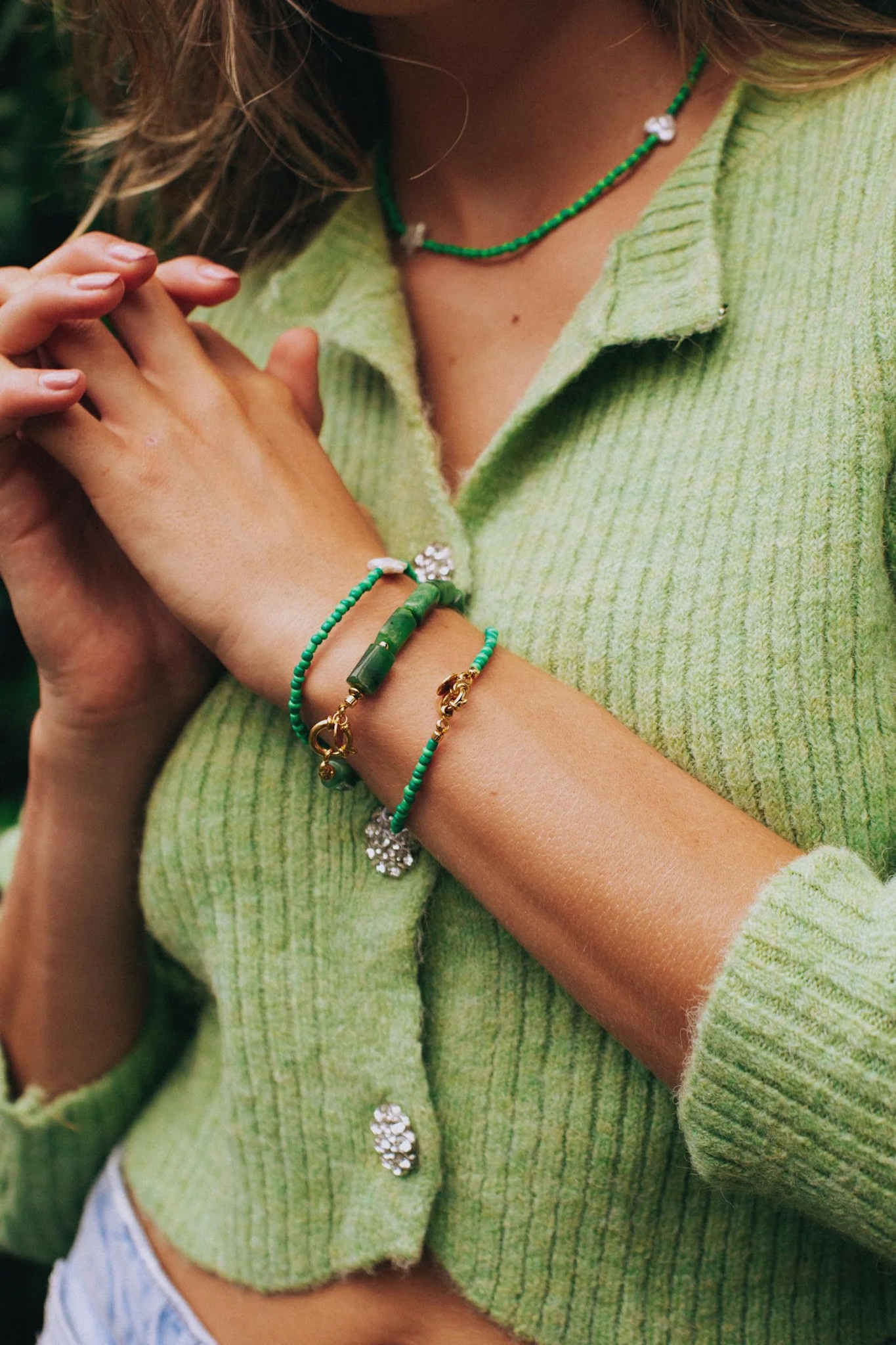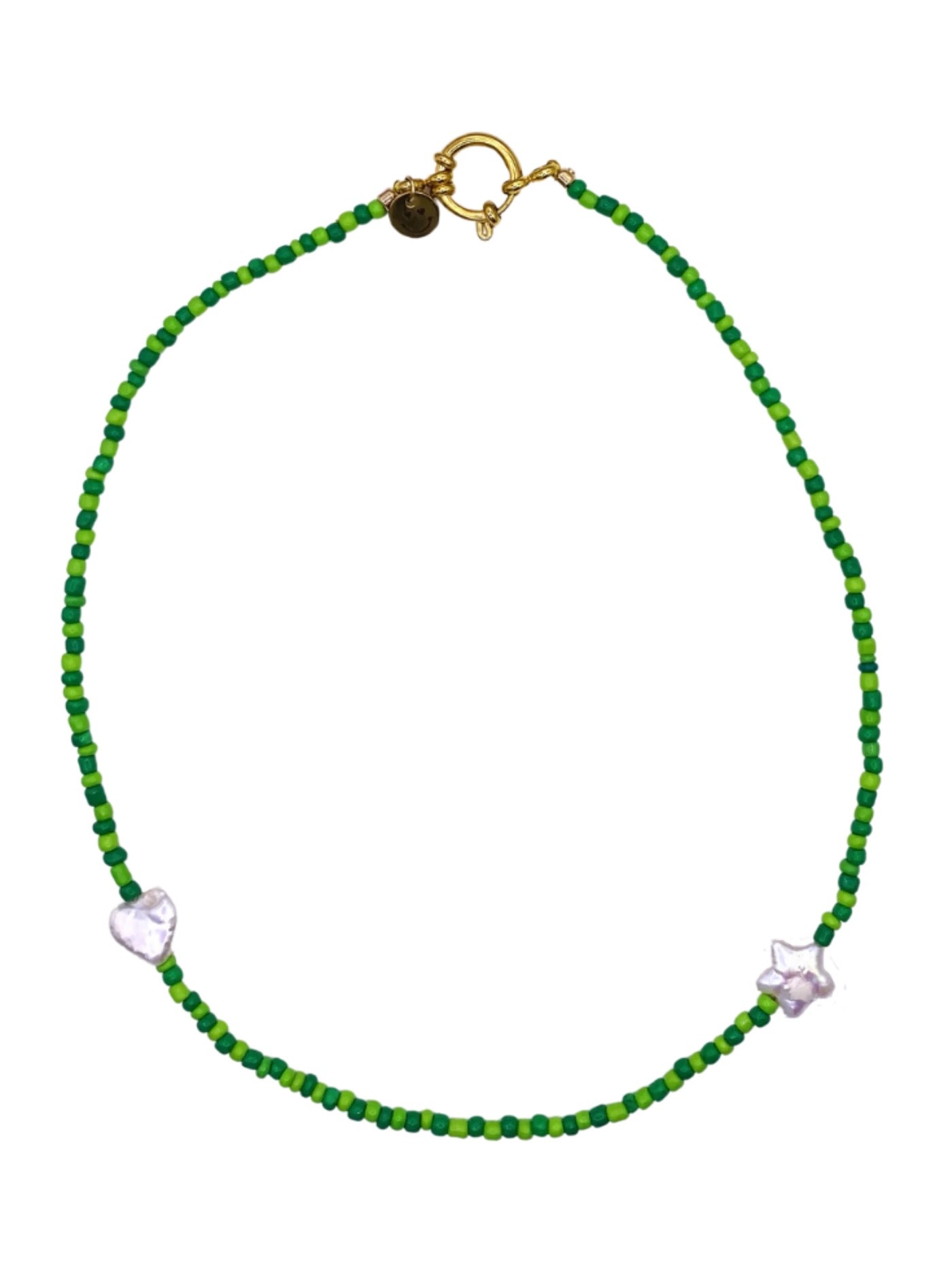 The Woody is made of Japanese beads and pearls in the shape of a heart and a star. The clasps is 18K gold plated stainless steel size 12 mm. ~ Length: 45 cm Green gives you balance ~ good luck ~ growth